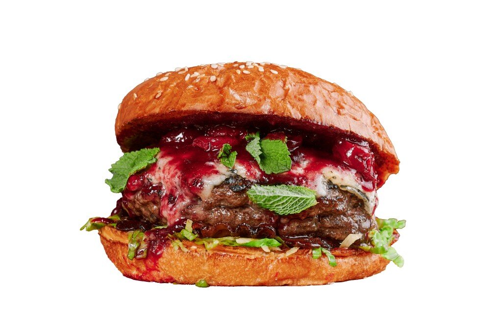 Булочка бриошь, котлета из мраморной говядины, салат айсберг, бекон, крем дорблю, соус вишнёвый, мята, сыр моцарелла, варенье из вишни