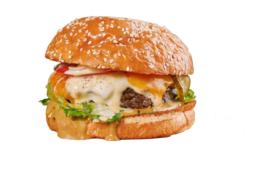 Булочка бриошь, котлета из мраморной говядины, салат айсберг, соус, соус сырный, томаты, лук фри, огурец маринованный, сыр чеддер красный, сыр моцарелла