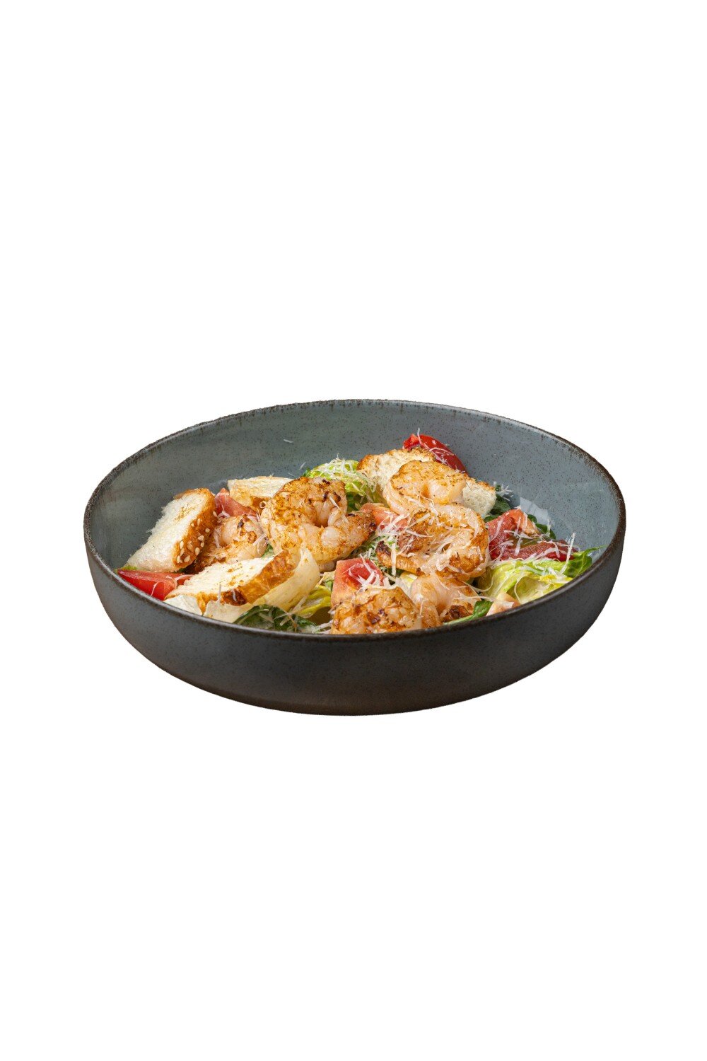 Креветки, микс-сала, пармезан, соус цезарь, гренки, томаты