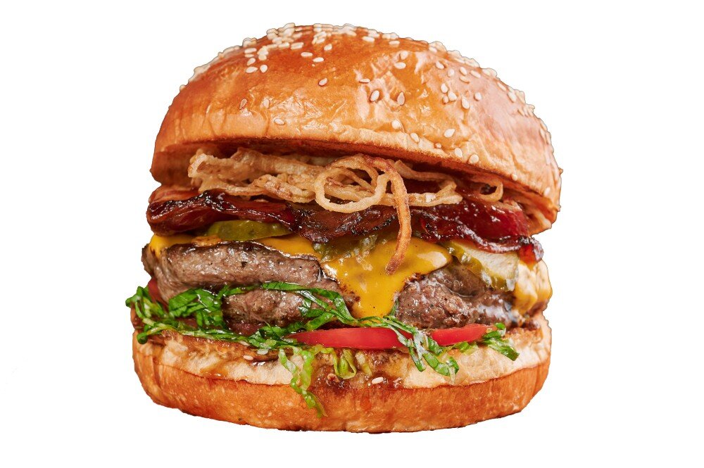 Булочка бриошь, котлета из мраморной говядины, салат айсберг, соус чимичурри, соус bbq, сыр чеддер, сыр гауда, лук конфитюр, бекон